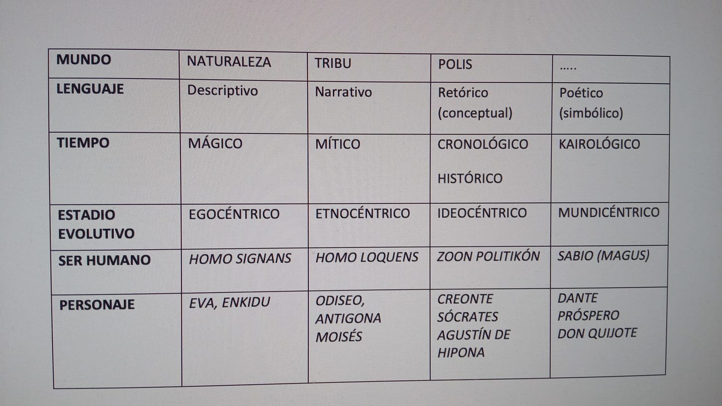 En su libro ya citado, Poderosas palabras[26], Northop Frye establece muy brillantemente una teoría evolutiva sobre la configuración del lenguaje en su relación con la comprensión del mundo y la emergencia cultural y social del ser humano. Sus planteamientos, no al pie de la letra, pero sí como inspiración y fuente, nos van a servir como resumen y síntesis de lo que venimos exponiendo hasta ahora. Hagamos primero un esquema de nuestra hipótesis, en la que intentaremos secuenciar la evolución del ser humano en su respuesta lingüística a su relación (y pertenencia) al mundo y su concepción del tiempo que, como sabemos desde Aristóteles, surge del lenguaje y no existe más allá de la mente en tanto que forma a priori de la sensibilidad (Kant).